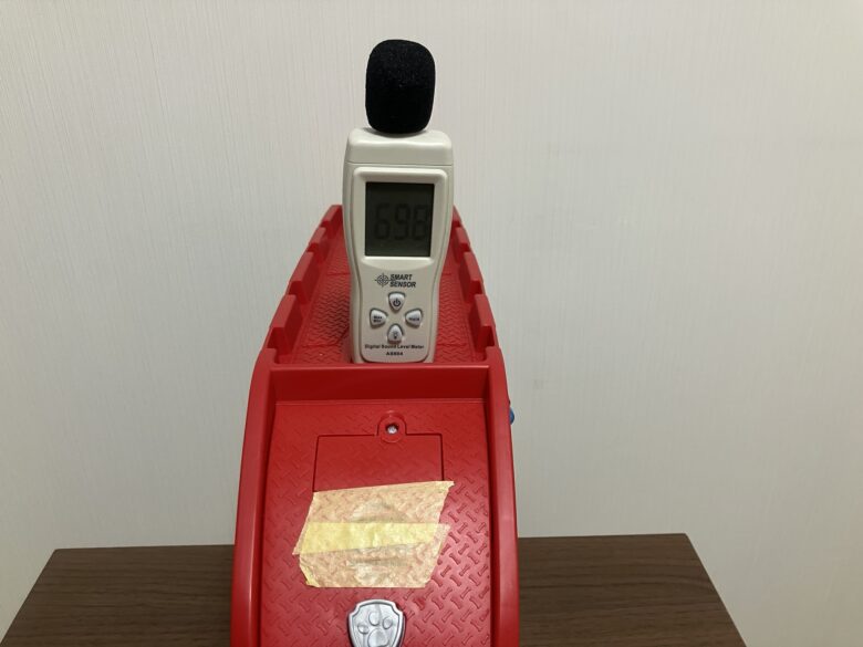 音がちょっと気になったので、テープを張ってみたら、69.8dBになりました。騒音レベルは「うるさい」で騒々しい事務所の中、騒々しい街頭、やかんの沸騰音と同等くらいになりました。