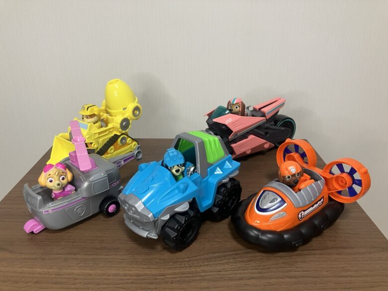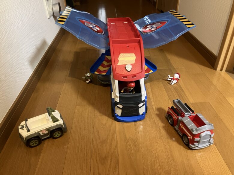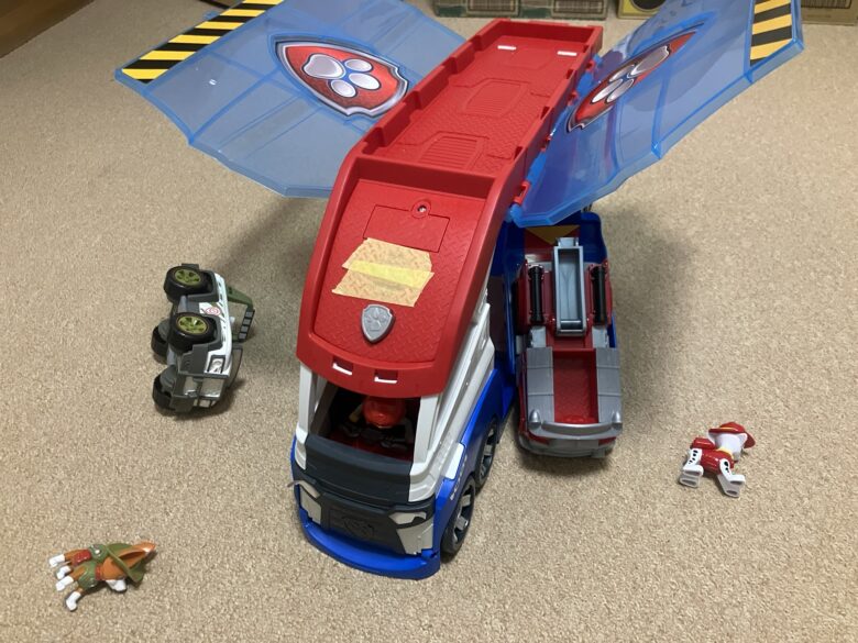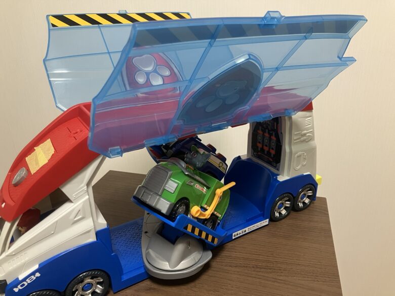 その他、収納には「パウ・パトロール ザ・マイティ・ムービー」関連のビークルなど、一部サイズや仕様が異なるシリーズのものは、うまく乗せられなかったり、発進ギミックが正常に作動しなかったりする場合があります。お手持ちのビークルが対応しているか不安な場合は、商品のパッケージ記載などを確認することをおすすめします。